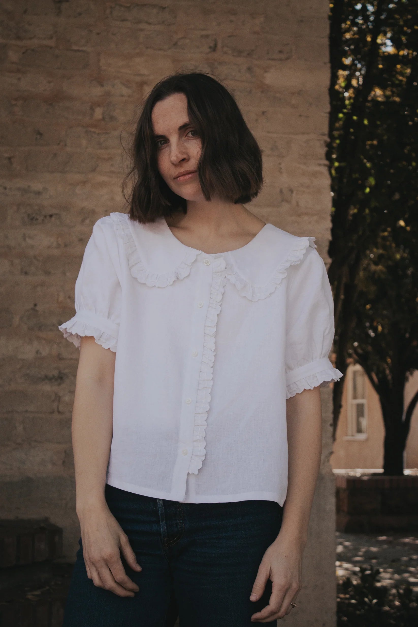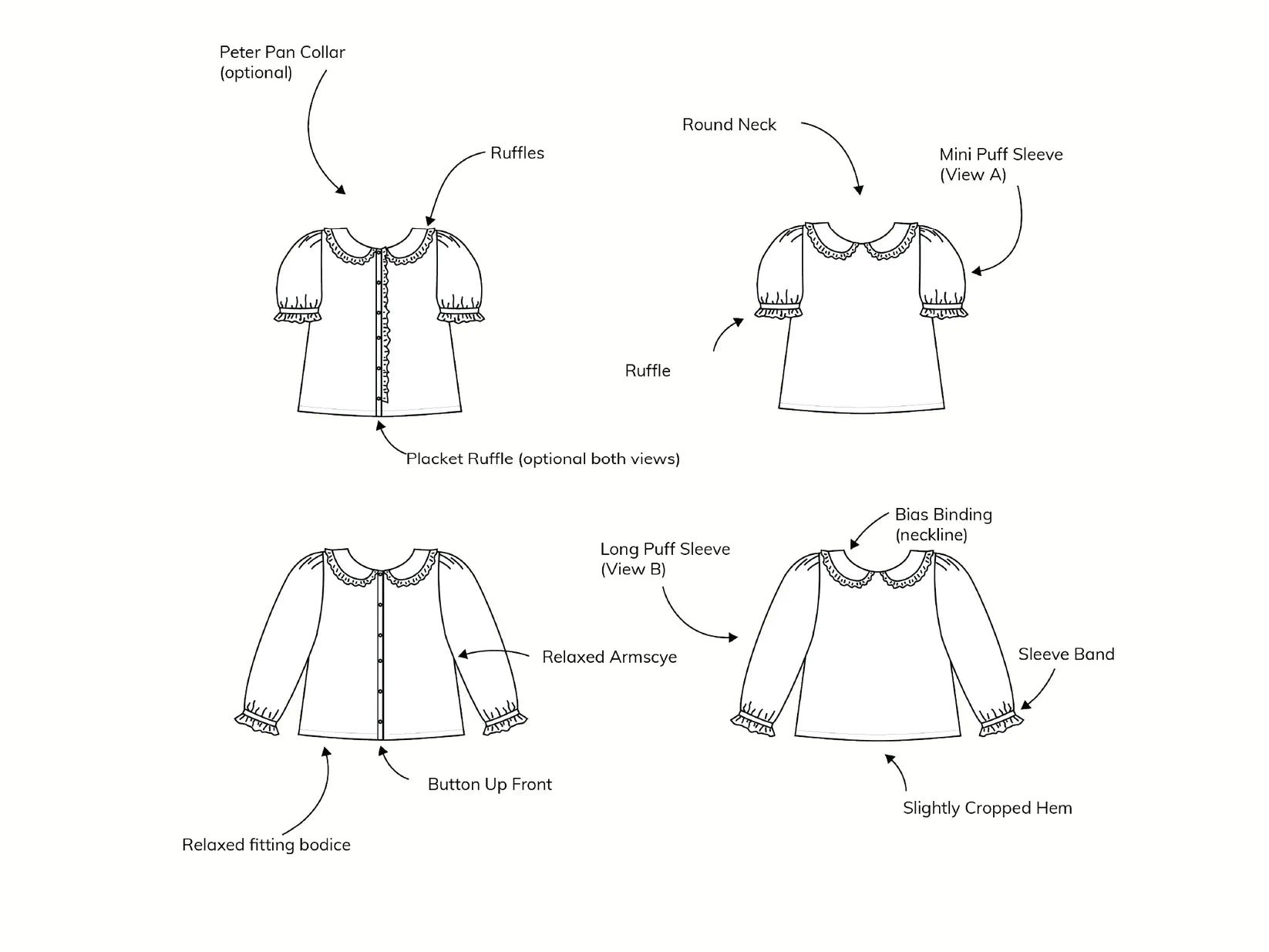 Beth is a timeless, elevated, and beginner-friendly blouse pattern. It features a Peter Pan collar, two sleeve lengths, short & long, a billowy bodice with generous ease, a slight puff sleeve with a low armscye for comfort, a button-down front, an optional placket ruffle, and a hidden bias-bound neckline.
