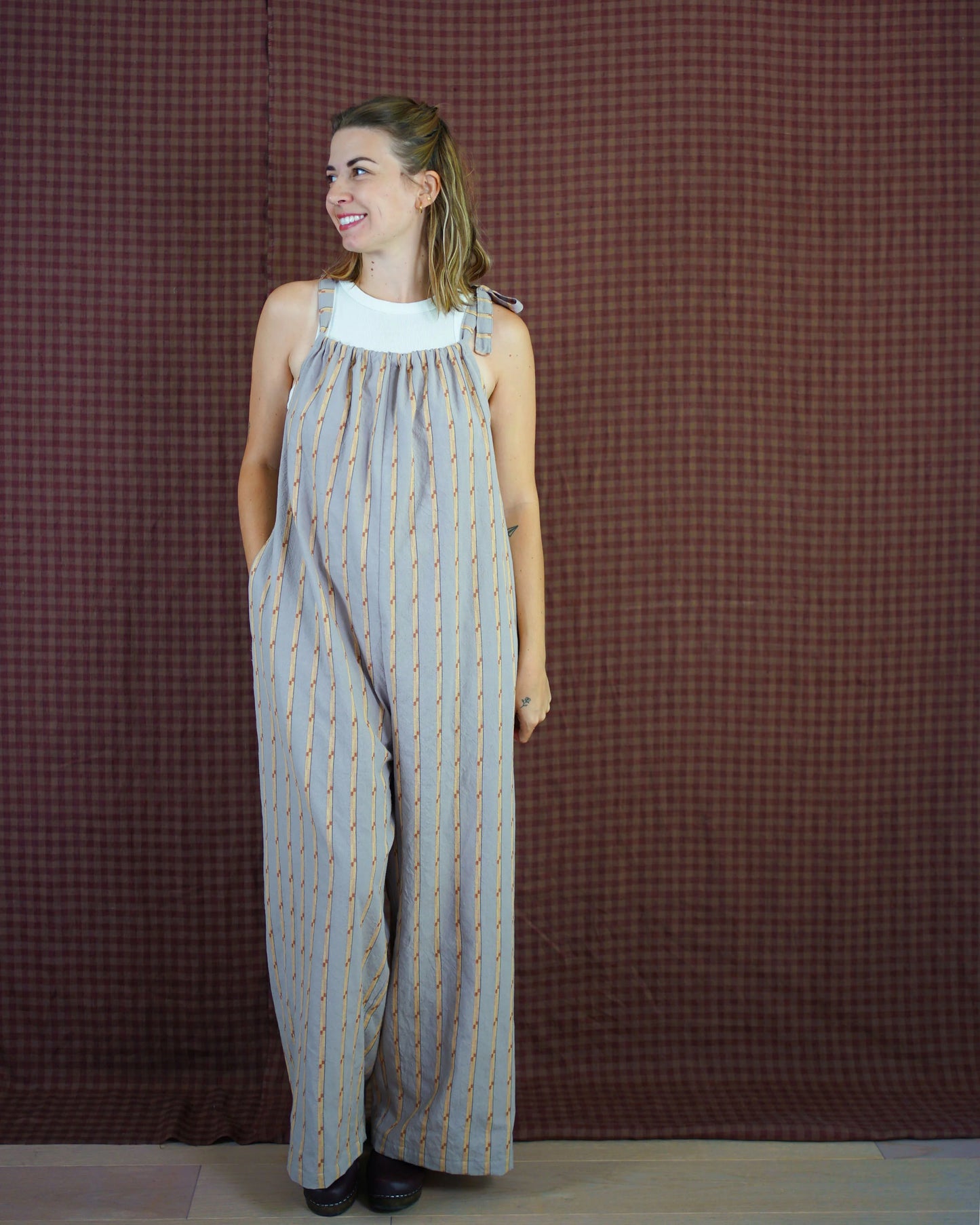 The Cabana Tie Playsuit is an easy to sew, effortless jumpsuit. The fit is slightly oversized and relaxed with wide, voluminous legs and a dropped crotch. It includes inseam pockets and a drawstring style shoulder strap that can be adjusted to your desired length and finished off in a large bow or knot.