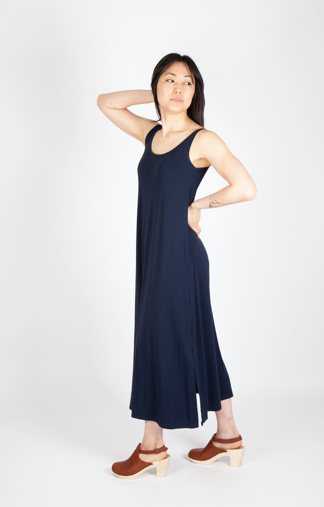 The Underwood Tank is one of the easiest knitwear patterns you will ever sew and wear. It was designed with hot weather comfort in mind and is the ultimate warm weather travel piece. This style was meant to cover a wide spectrum of summer weather wardrobe needs - anywhere from a swim suit cover-up to an out-to-dinner dress. All versions are sleeveless, fitted through the upper bust and then flowing into an A-line shape with a deep, curved back neckline that falls just above the bra-line for a little drama. The long (above the ankle) length dress also features long, knee length side vents. There are three options for hem lengths, two options for front neckline depths, and two options for neck and armhole finishing.