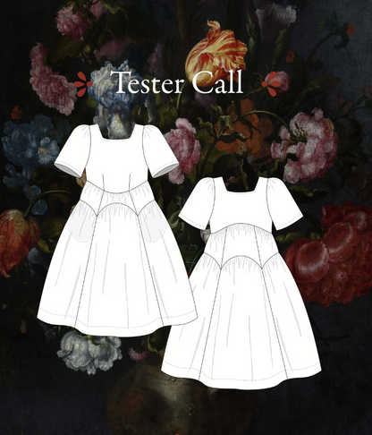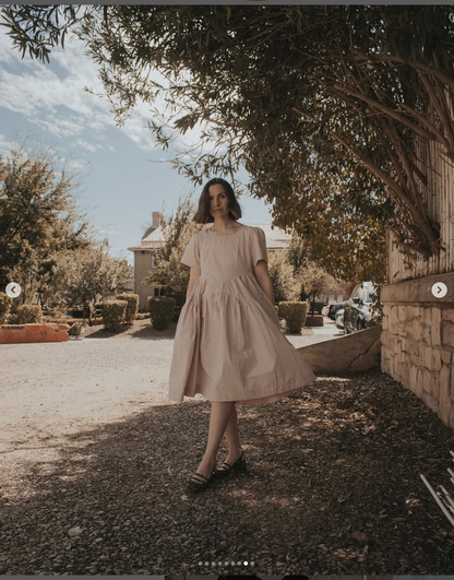 The Delft Dress is a unique, fun, and confident beginner-friendly sewing pattern. This pattern has darts, a bias bound rounded square neckline, puff short sleeves, a curved waistband, scalloped gathered skirt tiers, pockets, and a wide hem. Delft is not a form-fitted dress, but is full of generous ease, perfect for twirling.