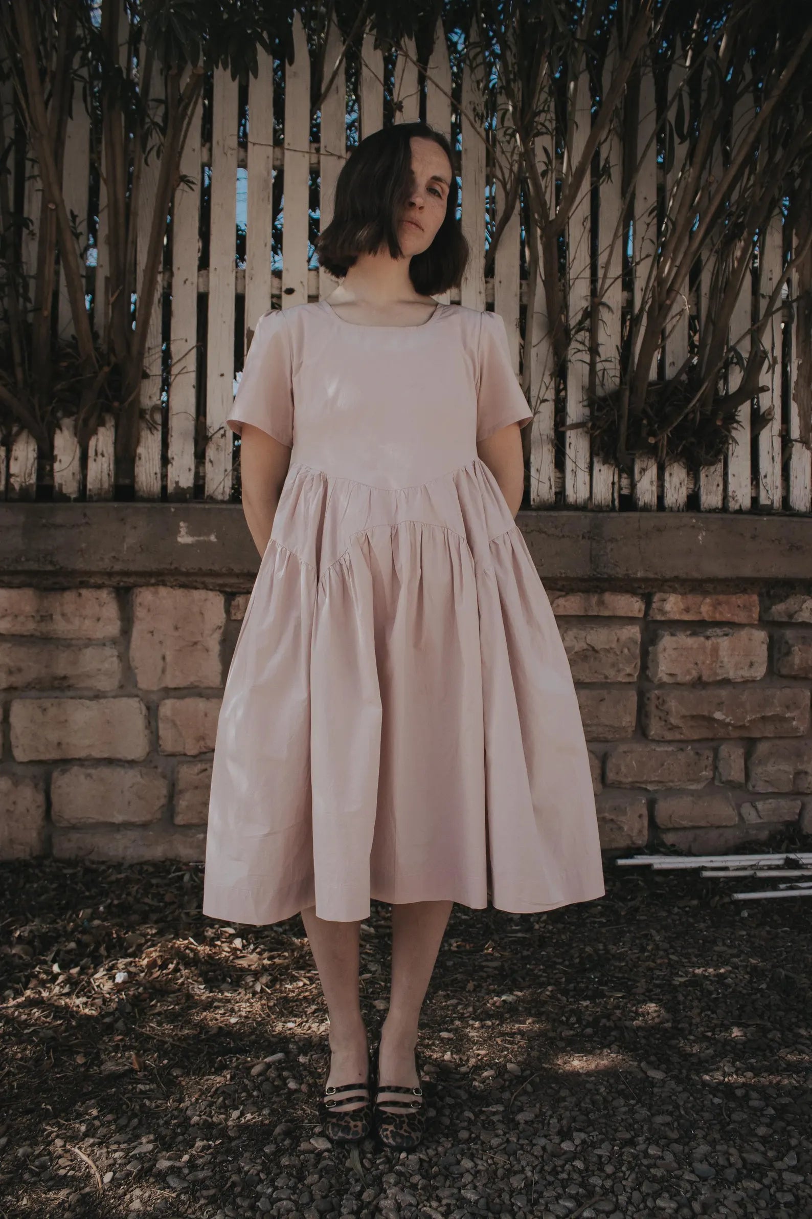 The Delft Dress is a unique, fun, and confident beginner-friendly sewing pattern. This pattern has darts, a bias bound rounded square neckline, puff short sleeves, a curved waistband, scalloped gathered skirt tiers, pockets, and a wide hem. Delft is not a form-fitted dress, but is full of generous ease, perfect for twirling.