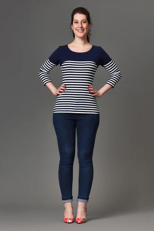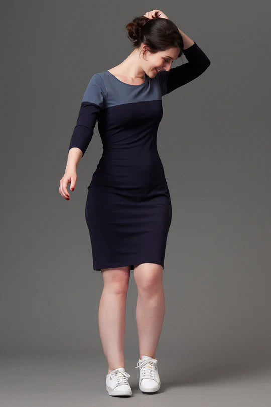Givre is a close-fitting knit top and dress with a classic band neckline, and a great project for smaller knit scraps in your stash.