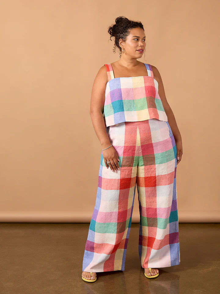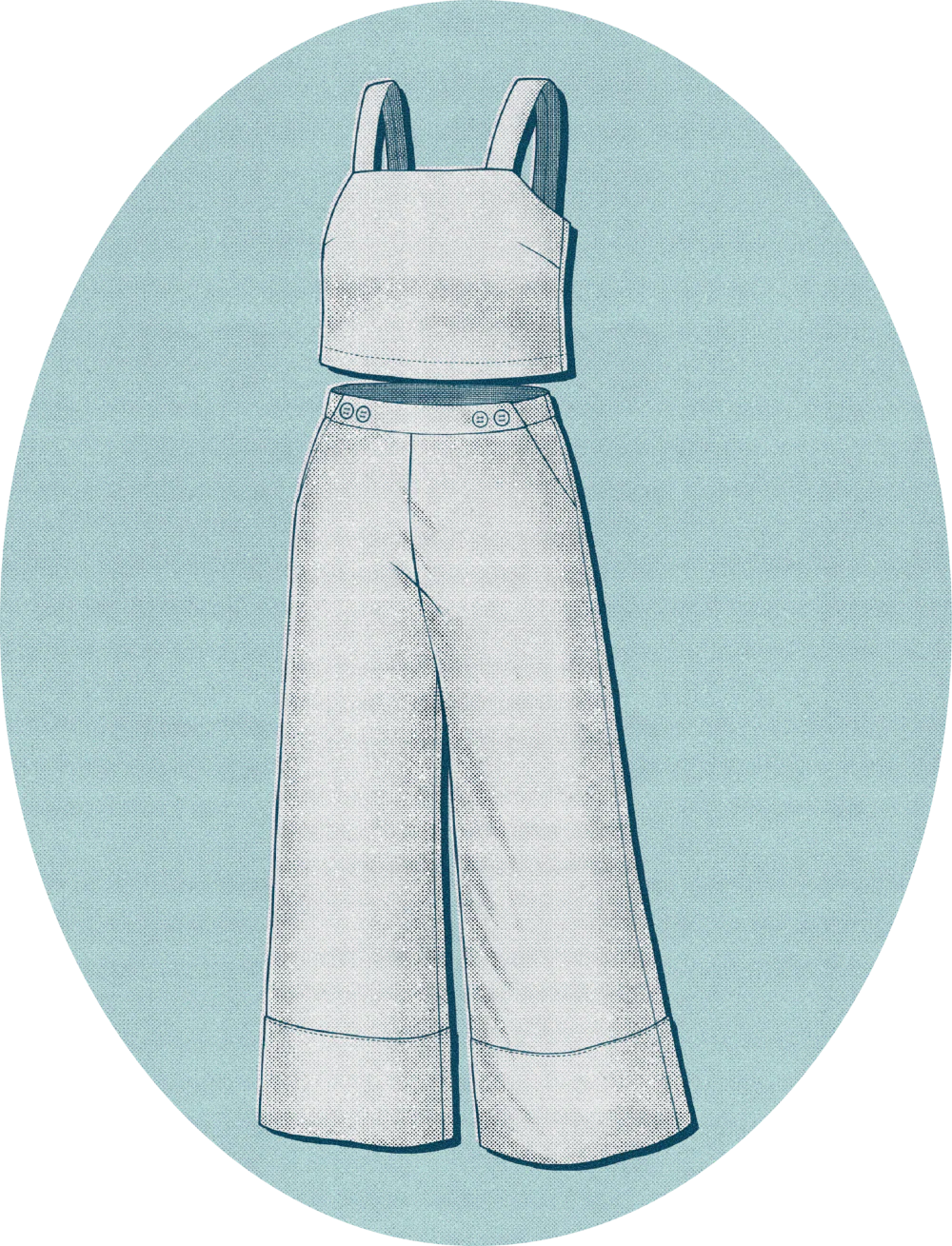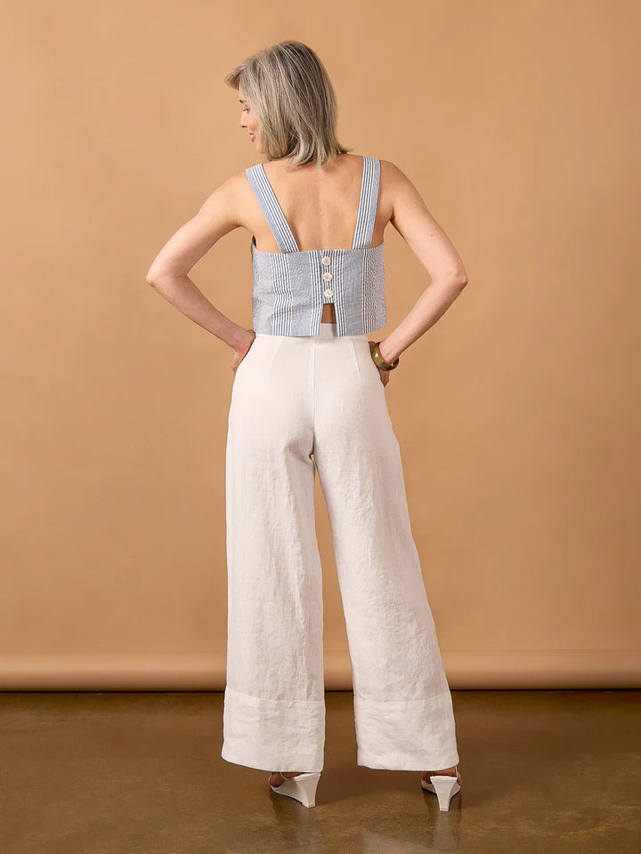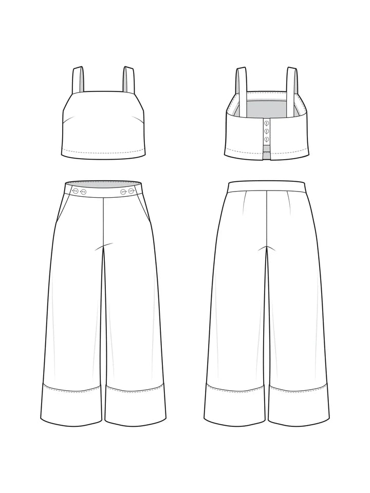 The Josephine Set captures the effortless glamour of 1930s beach pajamas—that chic loungewear that was equally at home poolside or at evening cocktails. This sophisticated two-piece set transitions seamlessly from lazy mornings to resort dinners. The relaxed cropped tank features wide straps, bust darts and a charming back button closure. High-waisted wide-leg pants complete the look with slanted pockets, sailor-inspired button details at the waistband, and deep top-faced hems for that perfect drape.