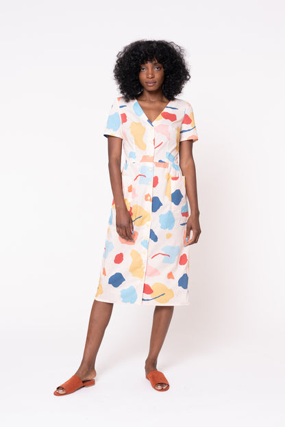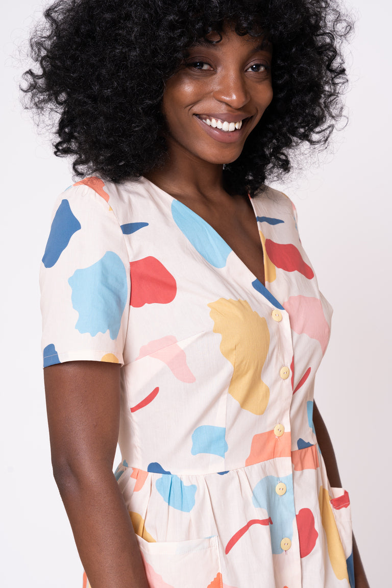 This dress won’t ever go out of style. The Killian dress features a classic silhouette with a fitted bodice, V-neckline, and gathered skirt, closing with buttons up the front. The neckline is finished with a facing, and it has patch pockets across the side seams.