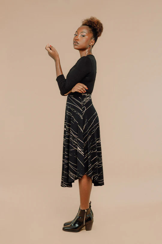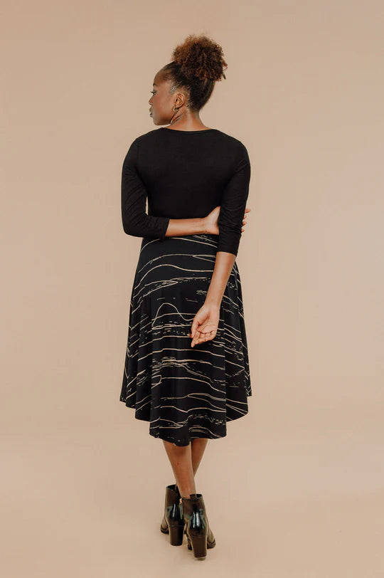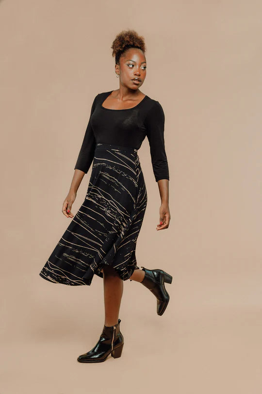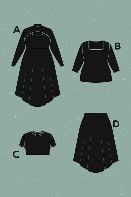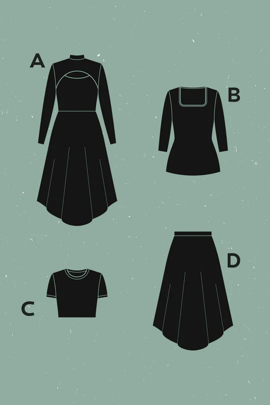 Orage is a dress, top, and skirt pattern designed for knits, as elegant as it is comfortable! Each version has an extra special detail so it works as a standout piece on its own, but together functions as a comprehensive and super stylish wardrobe builder.