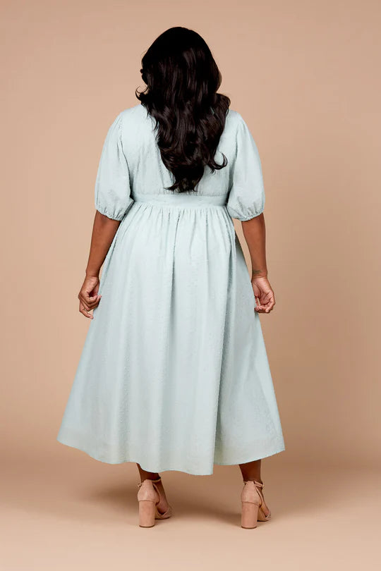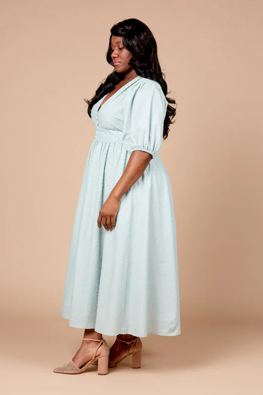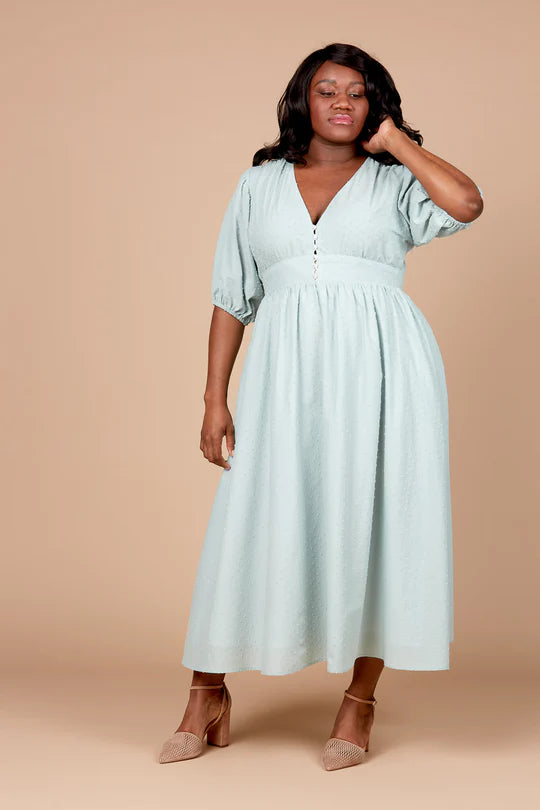 Romantic and soft, Orchidée is a princess-style dress and blouse with beautiful details. Both versions are fully lined (except the sleeves), with a structured waist, V neckline, and gathered sleeve, along with delicate bridal-style buttons and loops along the center front.