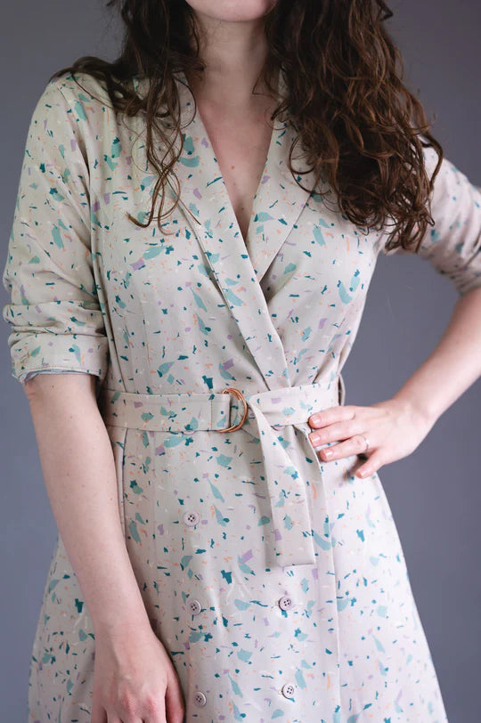Passiflore is a double-breasted coat dress with a tailored collar that can be made into a maxi dress, a knee-length dress, a shirt, or even a light jacket! Shaped with princess seams, a back yoke, and skirt panels, Passiflore can go sharp and modern or soft and romantic with your choice of fabric and details.