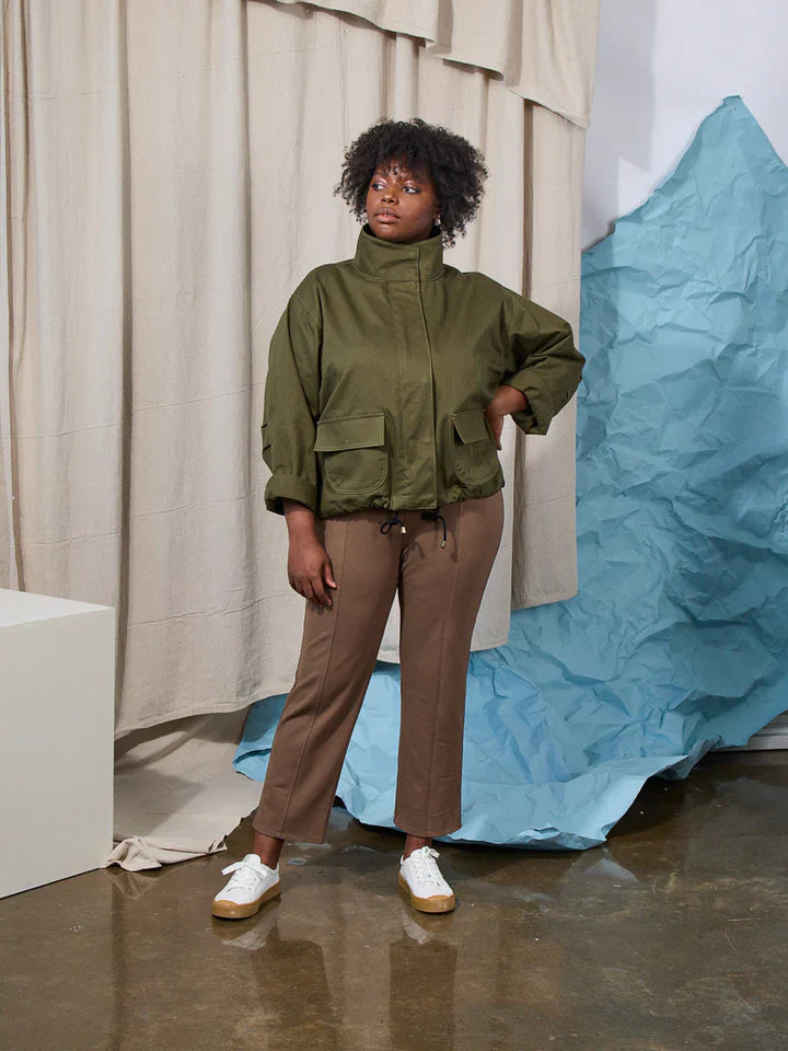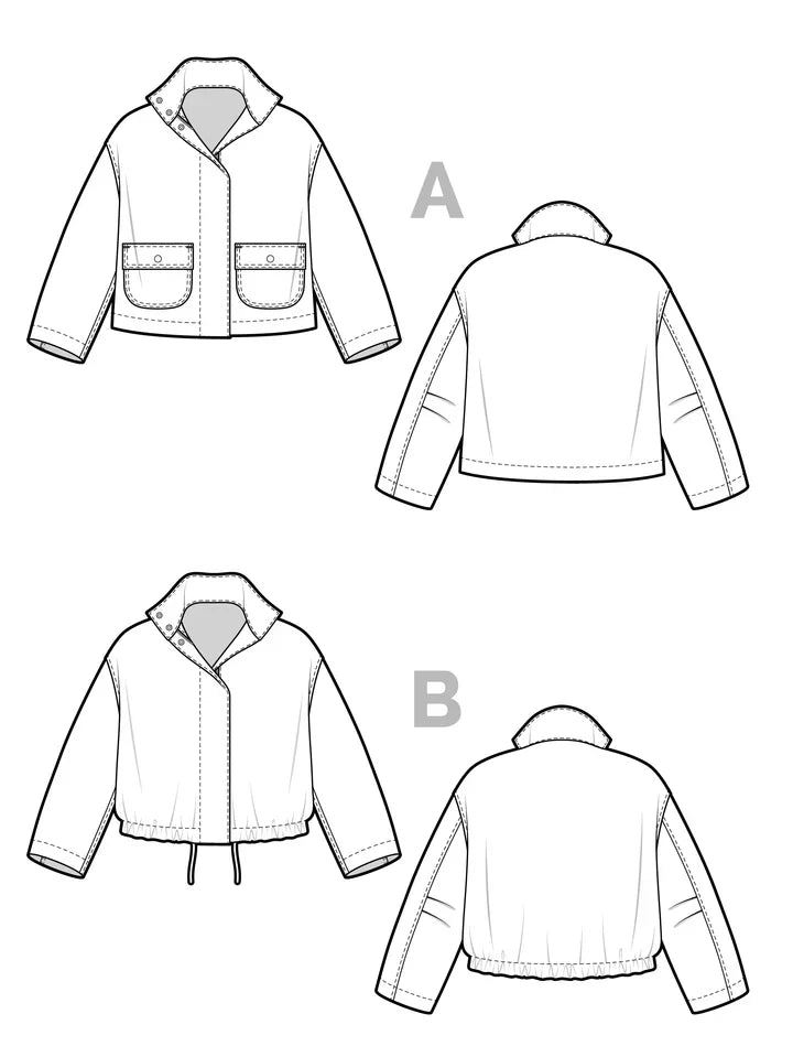 Effortlessly chic, Sandstone is an elevated jacket for transitional seasons! With a loose fit and short length ideal for layering, Sandstone is unlined and features a funnel collar, dropped shoulder, concealed zipper, snap buttons, and unique pleated sleeve. Personalize your jacket with optional patch pockets with flaps, or a drawstring waist for additional shaping.