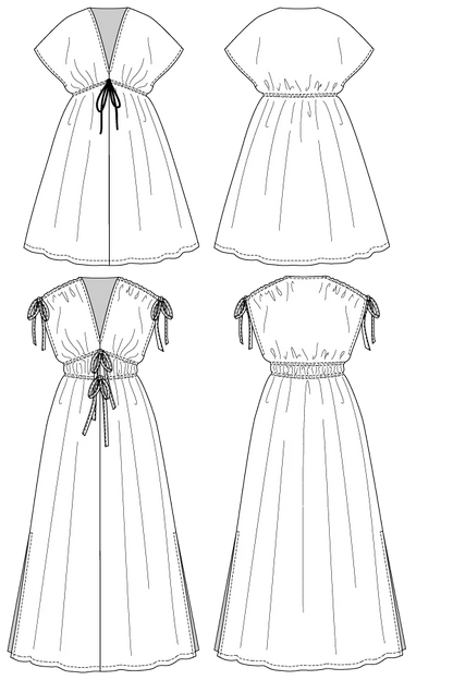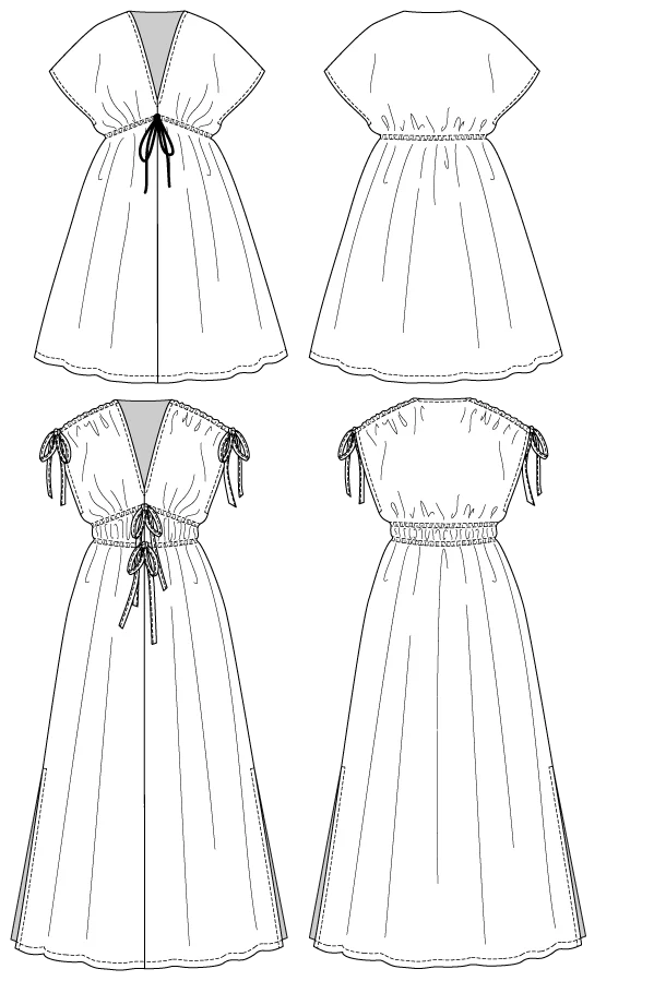 The Suvi caftan dress is an easy and versatile sewing pattern that includes two variations: a casual mini dress, and a bohemian maxi dress. Both designs have a deep V-neck, extended shoulder sleeves, and plenty of ease, which is gathered at the waist with a cord. The maxi dress also includes another waist cord, and gathered shoulders for a more elegant look. This design works well in a wide range of fabrics, and by varying the material you can make it into a relaxed everyday dress, an evening gown, or anything in between.