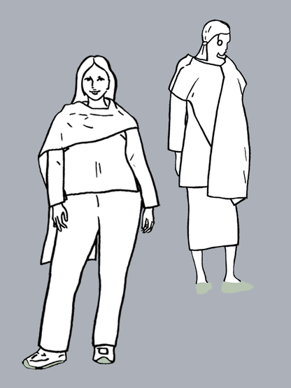 DORTE is a blouse or tunic with a draped silhouette defined by its long, attached shawl – an invitation to wrap, knot, or let it cascade freely. Elegant raglan sleeves flow gracefully with delicate slits at the cuffs for easy movement and subtle detail. Side slits at the hem of the bodice allow for a relaxed, airy fit.