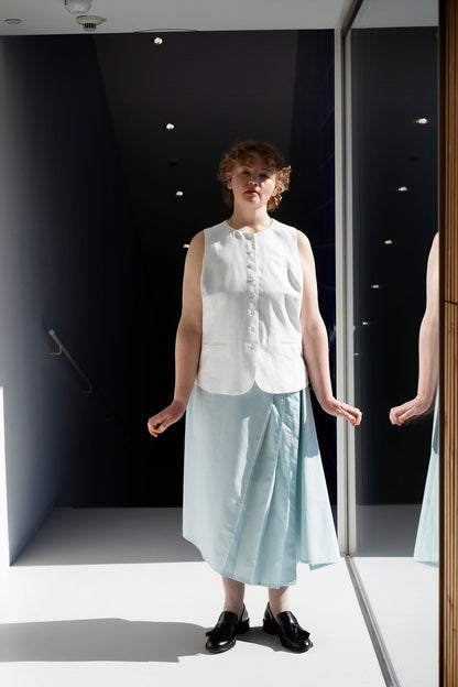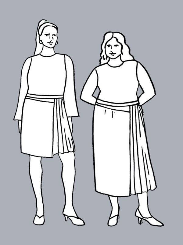 KIRSTI is an easy-to-sew asymmetrical skirt with a beautiful silhouette featuring a side godet and pleats.