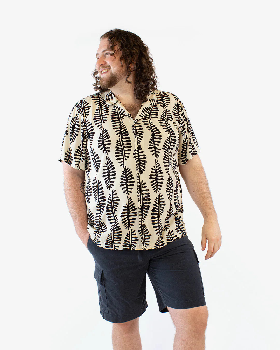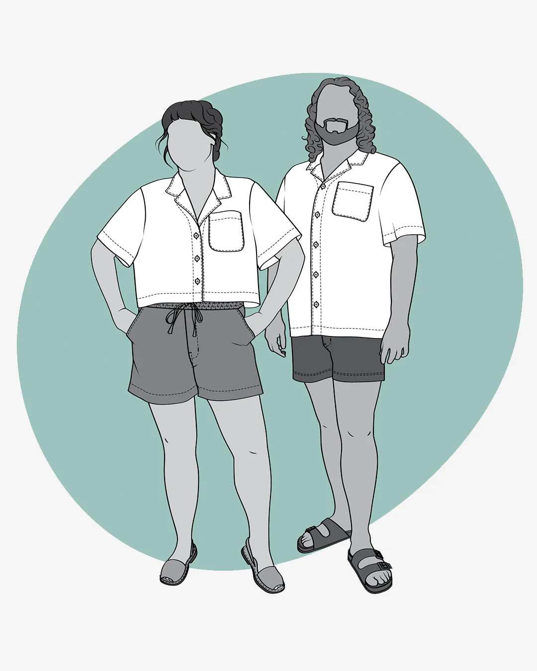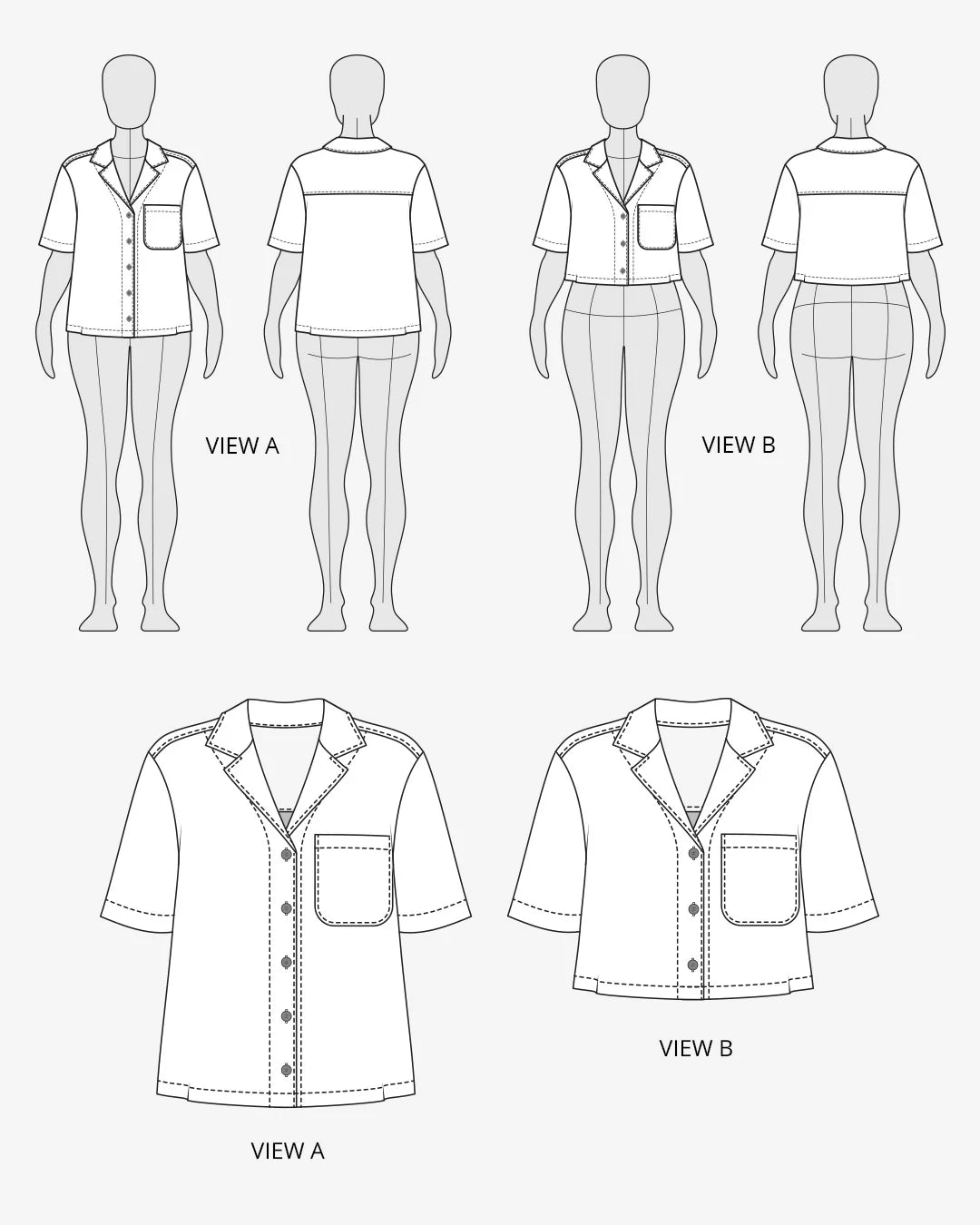 The Tofino top is an oversized, loose-fitting woven shirt with a relaxed silhouette and laid-back vibe. It features a classic camp collar, dropped shoulders, and a button-up front. Tofino does not have chest darts or bust shaping. View A is hip length, while View B is cropped. Both views feature short sleeves and a wide back yoke for a bold, boxy look. Designed for light to medium-weight wovens like rayon, linen, and cotton, the Tofino top is the perfect balance of comfort and cool.