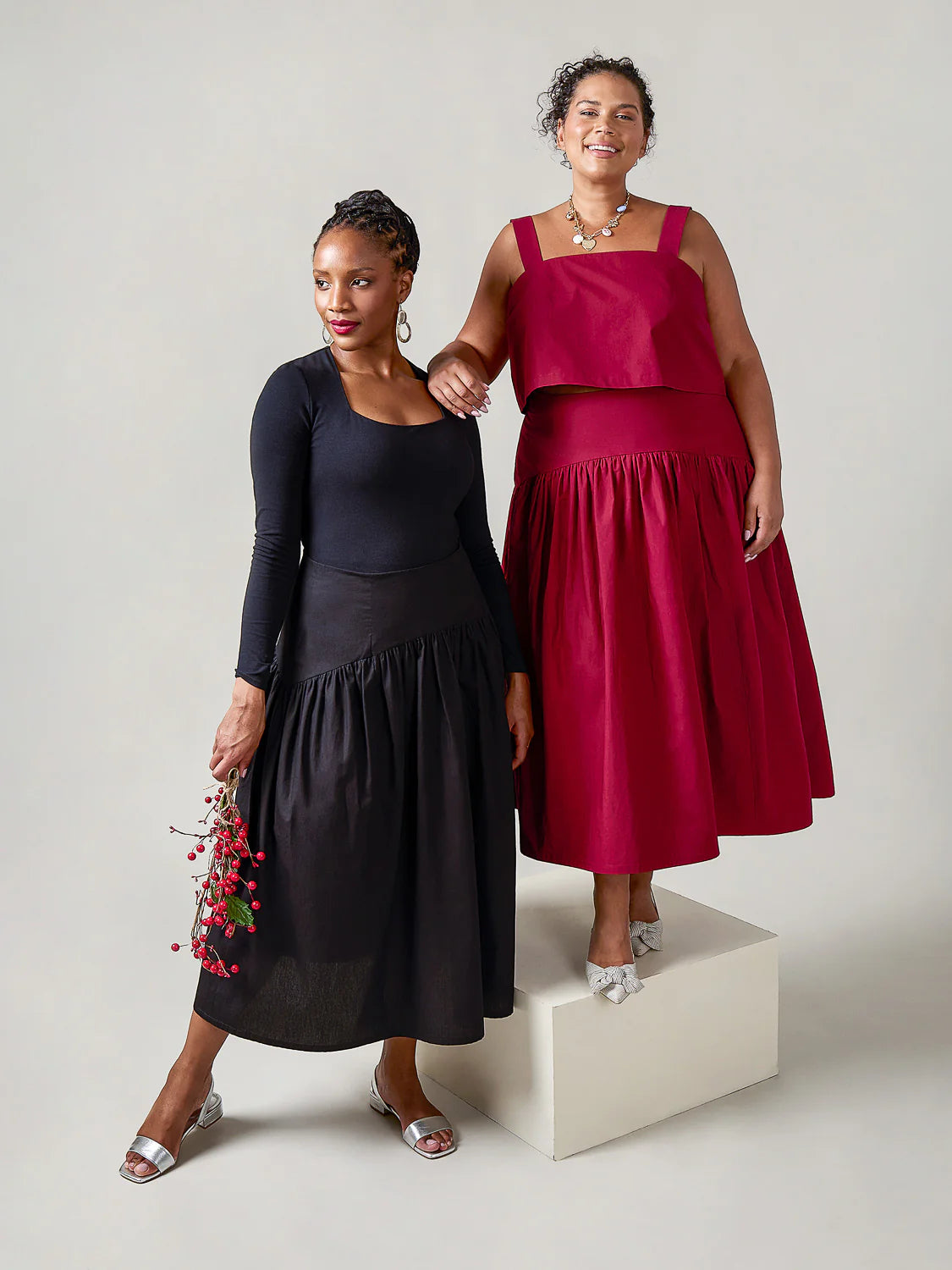 Twirl the night away in Zelda, a drop-waisted 1920s meets 50s meets 80s party skirt. The fitted yoke sits at the natural waist and is finished with a facing for a seamless look. The skirt closes with an invisible zipper at the center back. Gently curving from the center into a point at the side seams, the close-fit of the dropwaist blossoms into a densely gathered midi-length skirt. A beautiful separate to pair with all your tops, it shines in structured wovens that highlight the fullness of the silhouette.
